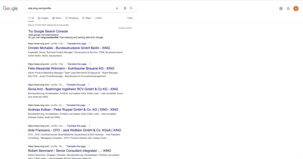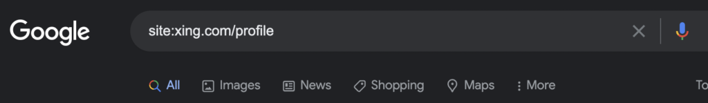 Das funktioniert aber nur sofern die Seiten auch bei den externen Suchmaschinen indexiert sind. Manchmal ist es jedoch hilfreich z.B. mit Google die Profile auf XING oder LinkedIn zu durchsuchen, als dieses direkt in den Netzwerken zutun. Durch die externe Abfrage ergeben sich nochmal andere Treffer.