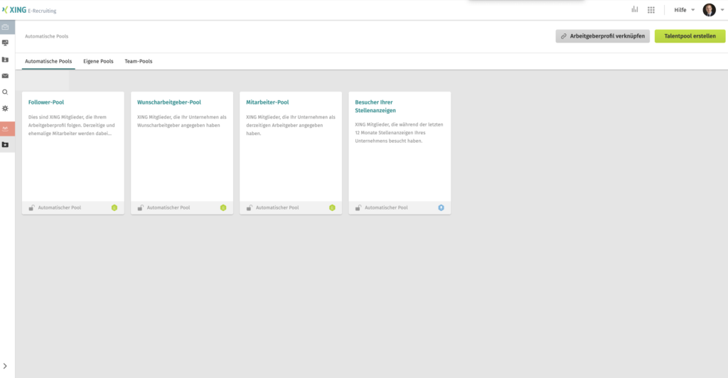 Mit dem XING Talentpoolmanager haben Arbeitgeber Zugriff auf User die irgendwie mit der eignen Marke interagieren. Speziell wenn das Unternehmen eine gute und reichweitenstarke Marke hat ist dieses Tool sehr hilfreich. Hier kann man speziell mit dem Follower-Pool, Wunscharbeitgeber-Pool, Mitarbeiter-Pool arbeiten und auch Besucher von Stellenanzeigen anzeigen lassen.