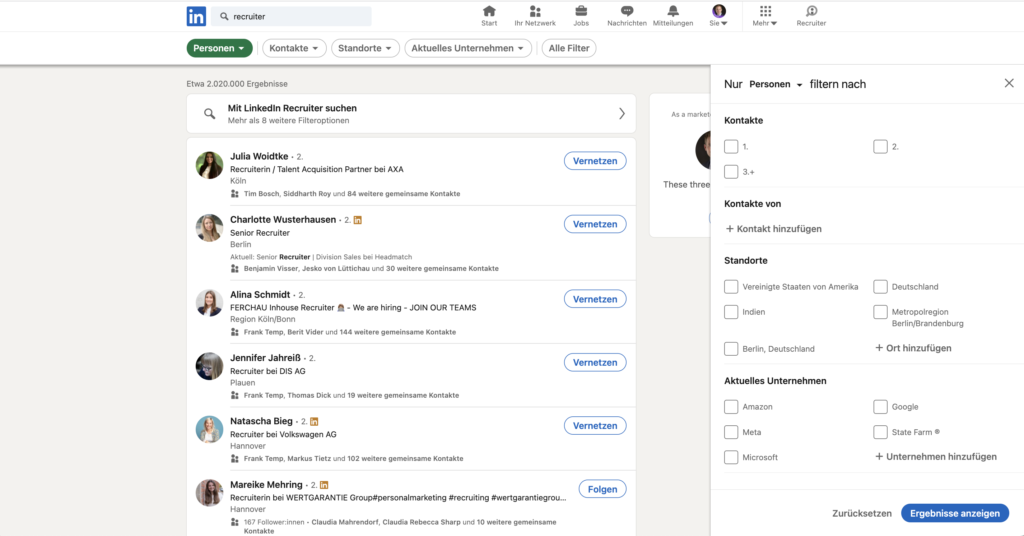 Die Möglichkeiten einer Suche mit einem LinkedIn Premium Account sind schon wirklich gut. Auch die Möglichkeiten der Kontaktaufnahme sind echt gut gemacht und durchdacht. Um herauszufinden ob ein LinkedIn Recruiter für eine Organisation sinnvoll ist können hier schon wirklich sehr viele Erkenntnisse gewonnen werden.