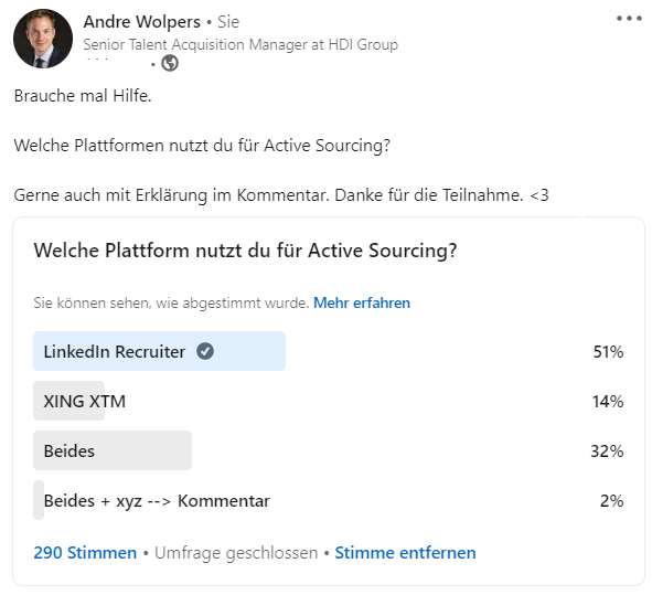 Umfrage: Ich habe kürzlich eine Befragung hier auf LinkedIn gestartet. (290 Stimmen!) Nach dieser Umfrage nutzen 32% den XING XTM (Xing Talentmanager) und LinkedIn Recruiter gleichzeitig für das Sourcing von Talenten, 51% nutzen NUR den LinkedIn Recruiter und 14% nutzen NUR den XING Talentmanager. Lediglich 2% nutzen sowohl XING als auch LinkedIn und darüber hinaus noch weitere Tools.